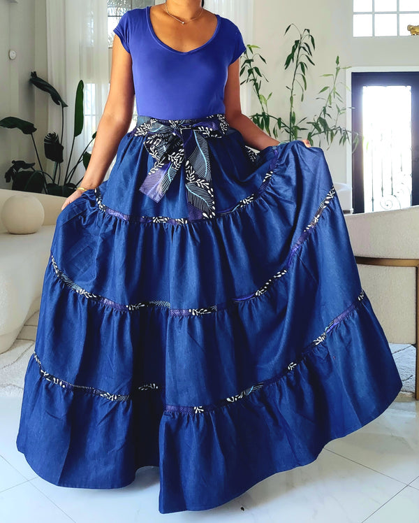 Long Denim Flare Skirt with Scarf