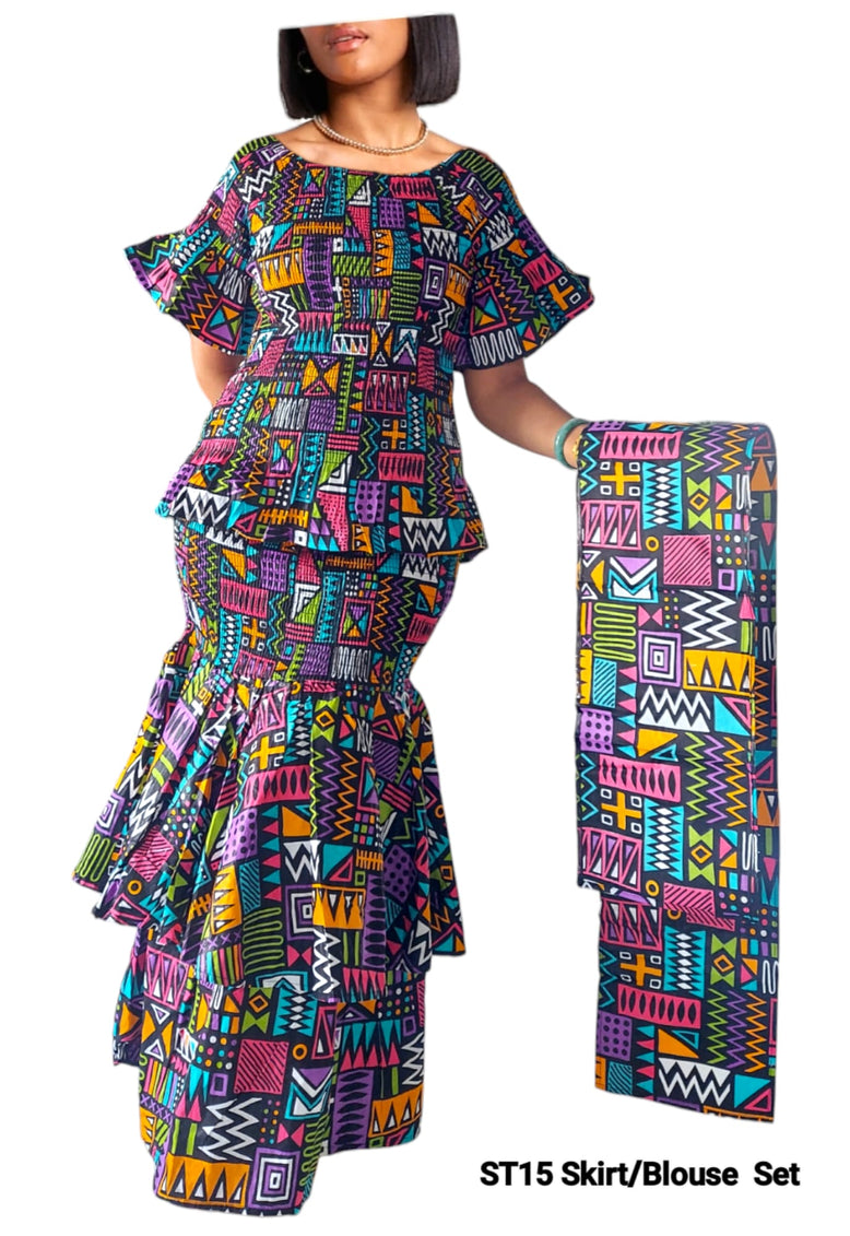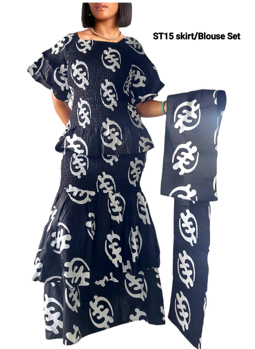 Woman skirt set includes 1 blouse, 1 long skirt & 1 head scarf.
